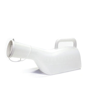 The ergonomic shape aligns with the male anatomy for comfort and accurate use. Its wide opening and sturdy handle allow for safe, steady handling.