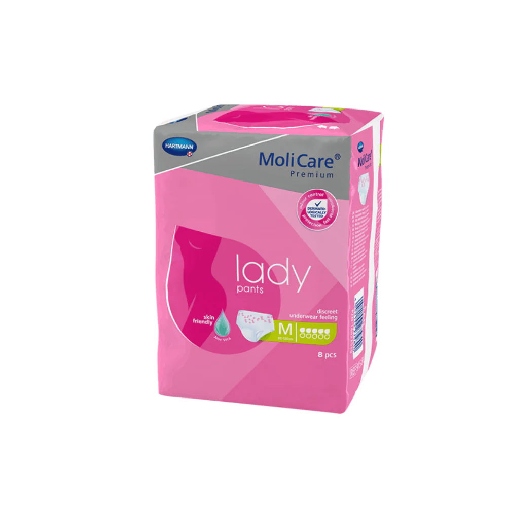 MoliCare Premium lady pants look and feel like regular underwear and are ideal for light to moderate levels of bladder weakness. The pants contain skin friendly Aloe Vera as well as a 3-layer absorbent core that pulls fluid away from the surface, so the skin stays dry, healthy, and free from odors. It also has unique curly fiber technology that helps to maintain the skin’s natural pH level and is important in reducing infection and skin irritation caused by incontinence.